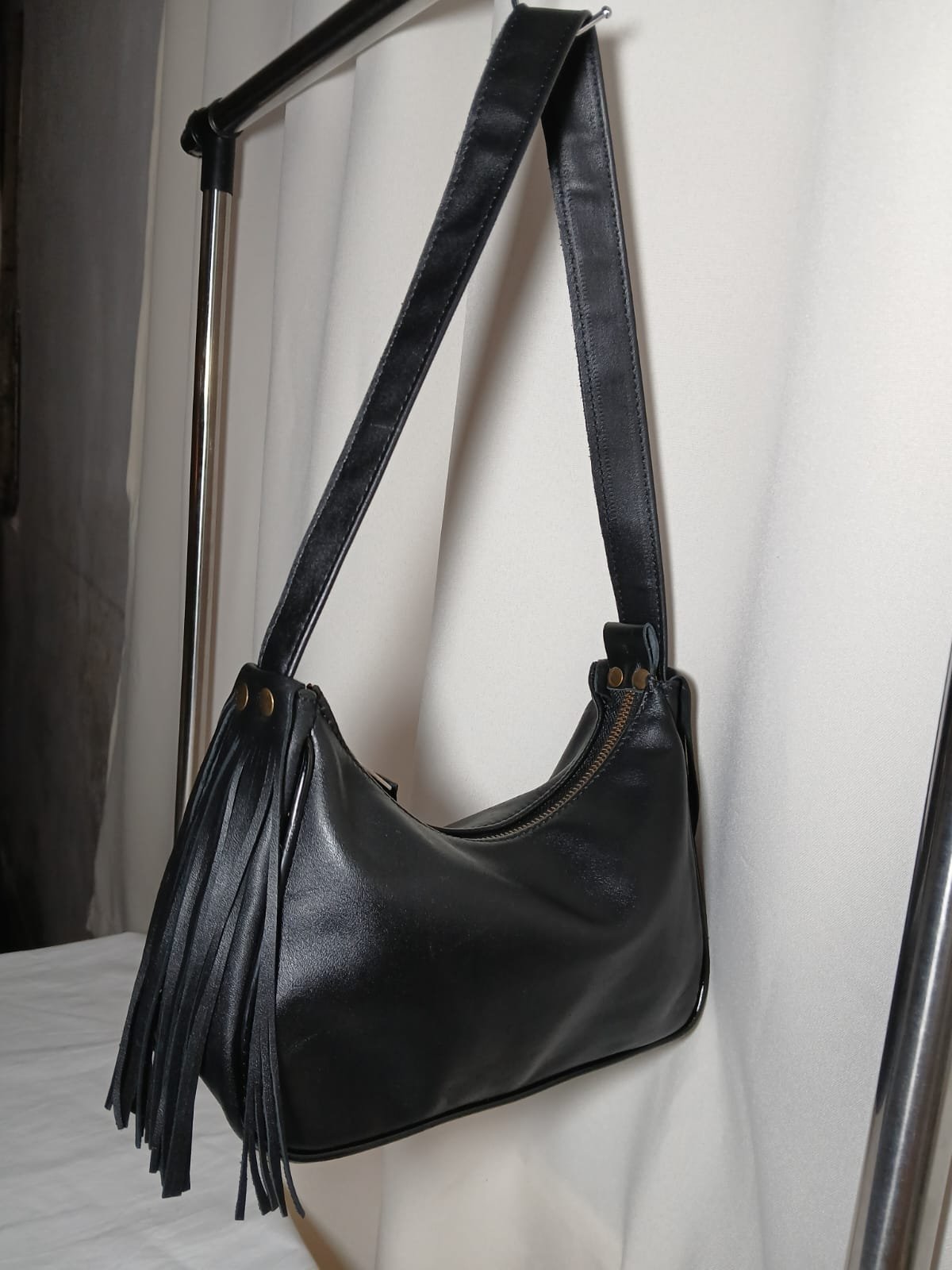 Cada pieza es realizada de manera artesanal, cuidando cada detalle del diseño y el acabado. Además, incorpora flecos que aportan carácter y un toque distintivo, manteniendo un estilo moderno y versátil.