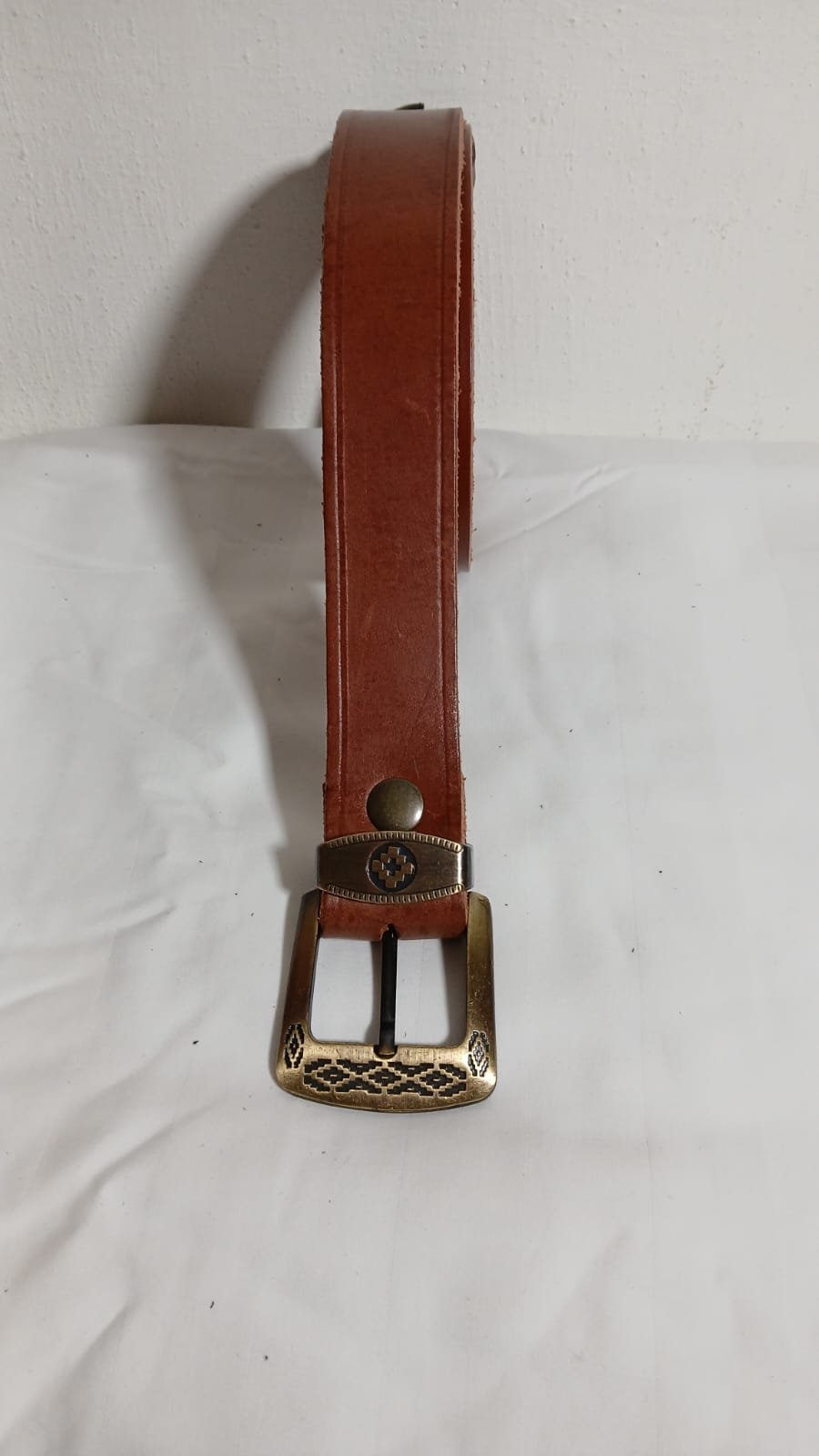 Cinturón de vaqueta en tono marrón claro, diseñado con una línea clásica y detalles que realzan su estilo artesanal. Confeccionado en cuero genuino, ofrece resistencia, durabilidad y un calce cómodo para el uso diario. Incorpora hebilla estilo pampa en acabado metálico, que aporta un toque tradicional y distintivo.